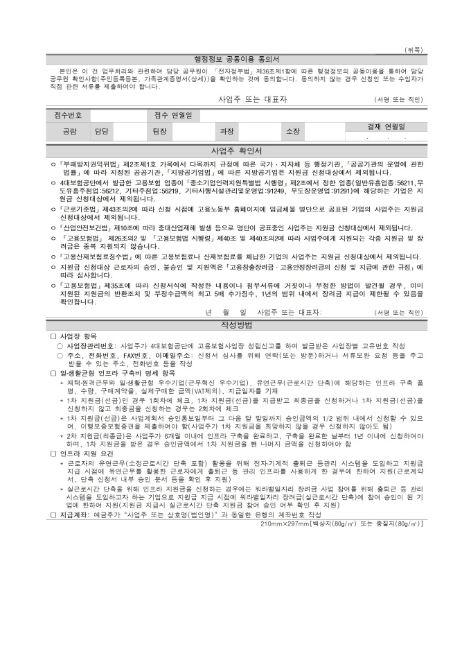 9,000원/월일가정 양립 환경개선(일생활균형 인프라) 지급 신청서로, 고용창출장려금ㆍ고용안정장려금의 신청 및 지급에 관한 규정 [별지 제24호의2 서식] 서식입니다. 소속 근로자가 일․생활균형을 위해 유연근무를 활용하거나 재택․원격․근무혁신․유연근무 등을 위해 인프라를 구축하는 경우에 사업주를 지원하는 제도를 위한 서식입니다.