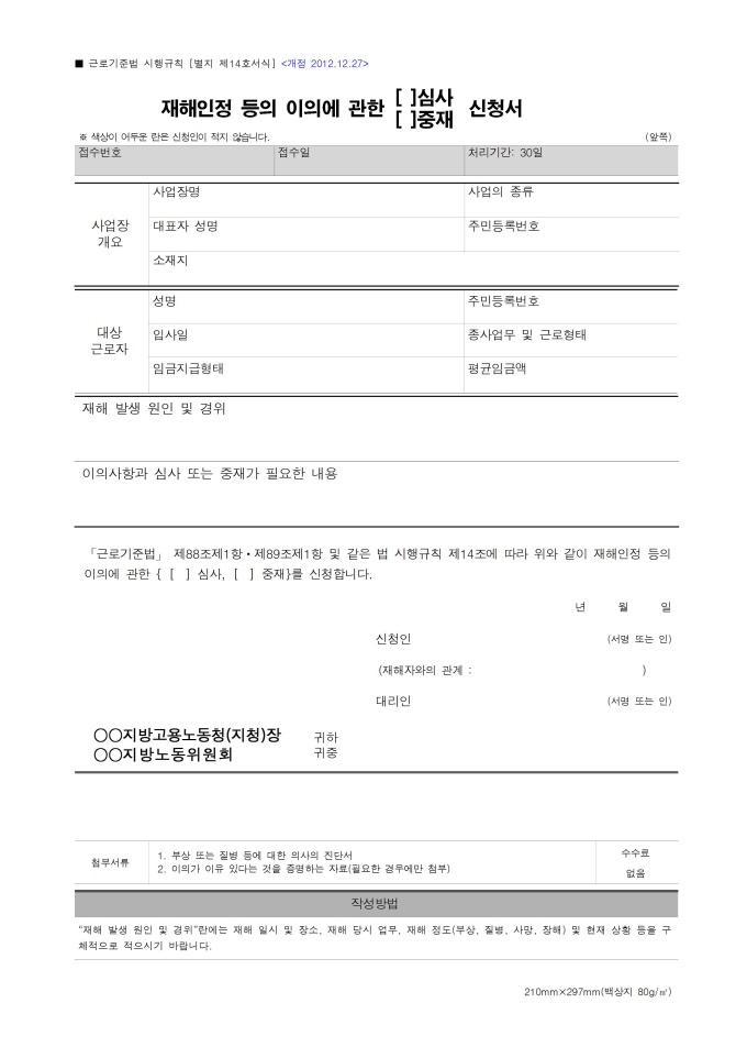 9,000원/월재해인정 등의 이의에 관한(심사, 중재)신청서(근로기준법 시행규칙) [별지 제14호서식] 서식입니다. 근로기준법 제88조제1항, 제89조제1항 및 같은 법 시행규칙 제14조에 따라 재해인정 등의 이의에 관한 심사 또는 중재를 신청하고자 할 때 사용할 수 있는 서식입니다. [2012. 12. 27 개정]