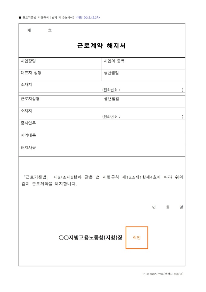 9,000원/월근로계약 해지서(근로기준법 시행규칙) [별지 제19호서식] 서식입니다. 근로기준법 제67조제2항과 같은 법 시행규칙 제16조제1항제4호에 따라 근로계약을 해지할 때 사용할 수 있는 서식입니다. [2012. 12. 27 개정]