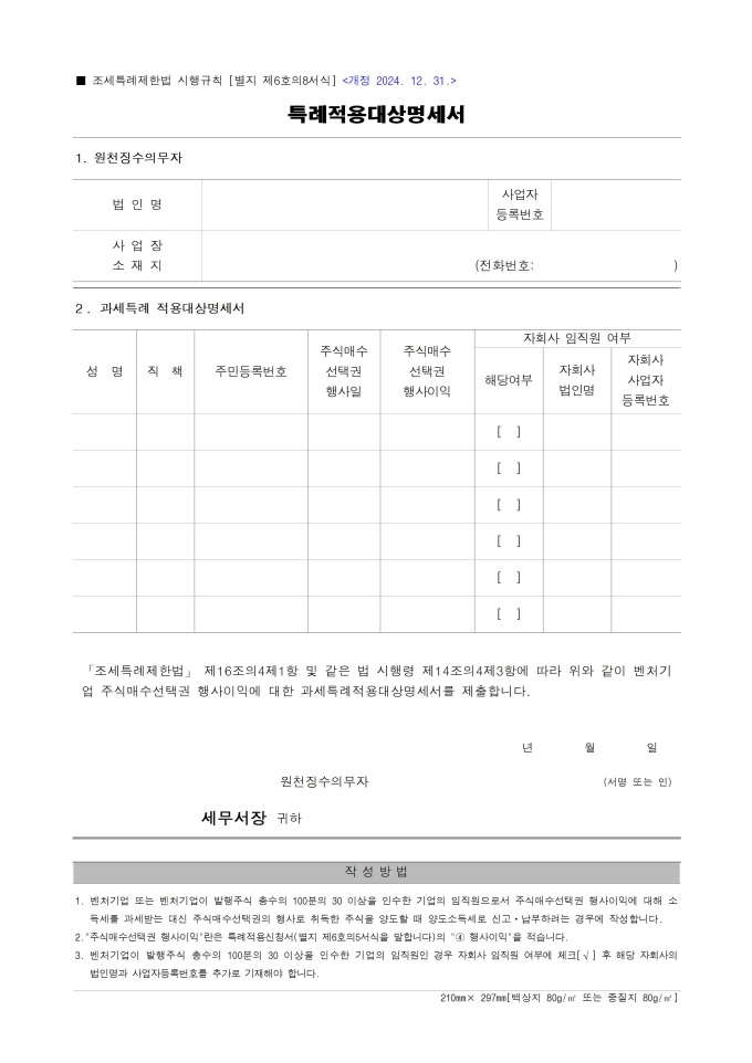 9,000원/월특례적용대상명세서 서식입니다. 「조세특례제한법」 제16조의4제1항 및 같은 법 시행령 제14조의4제3항에 따라 벤처기업 주식매수선택권 행사이익에 대한 과세특례적용대상명세서를 제출하고자 할 때 사용할 수 있는 서식입니다. 조세특례제한법 시행규칙 [별지 제6호의8서식] <개정 2024. 12. 31.>