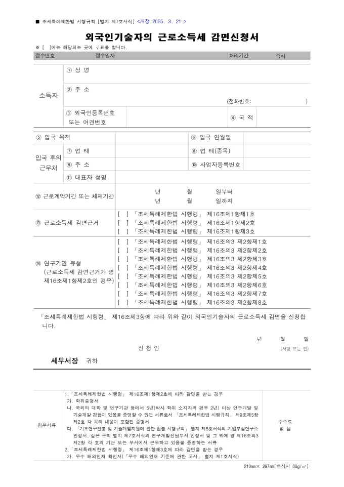9,000원/월외국인기술자의 근로소득세 감면신청서 서식입니다. 「조세특례제한법 시행령」 제16조제3항에 따라 외국인기술자의 근로소득세 감면을 신청하고자 할 때 사용할 수 있는 서식입니다. 조세특례제한법 시행규칙 [별지 제7호서식] <개정 2025. 3. 21.>