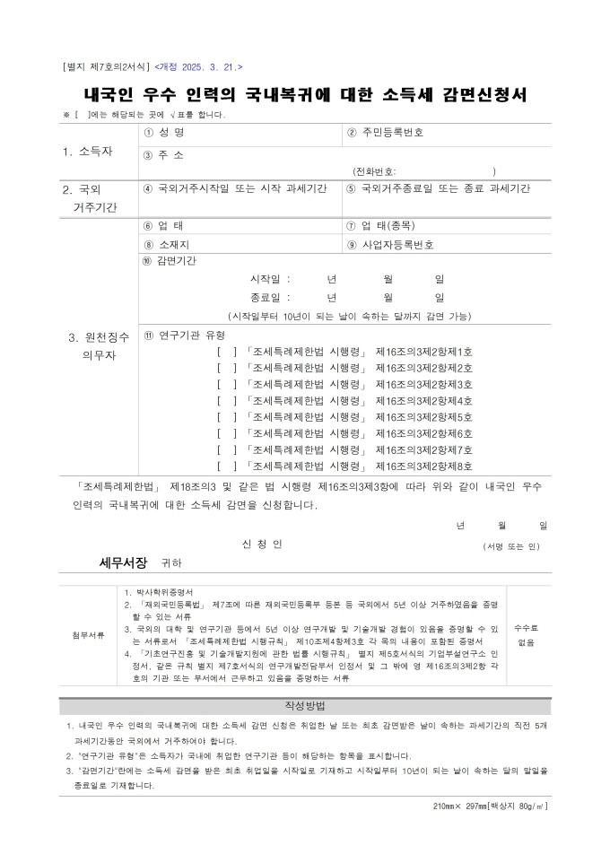 9,000원/월내국인 우수 인력의 국내복귀에 대한 소득세 감면신청서 서식입니다. 「조세특례제한법」 제18조의3 및 같은 법 시행령 제16조의3제3항에 따라 내국인 우수 인력의 국내복귀에 대한 소득세 감면을 신청하고자 할 때 사용할 수 있는 서식입니다. [별지 제7호의2서식] <개정 2025. 3. 21.>