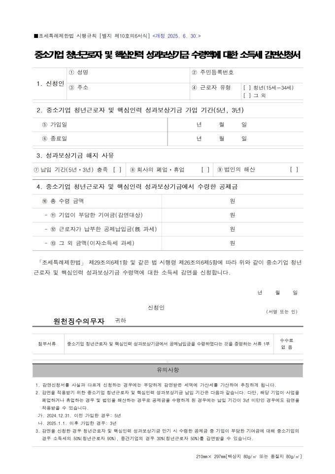 9,000원/월중소기업 청년근로자 및 핵심인력 성과보상기금 수령액에 대한 소득세 감면신청서 서식입니다. 「조세특례제한법」 제29조의6제1항 및 같은 법 시행령 제26조의6제5항에 따라 중소기업 청년근로자 및 핵심인력 성과보상기금 수령액에 대한 소득세 감면을 신청할 때 사용할 수 있는 서식입니다. 조세특례제한법 시행규칙 [별지 제10호의6서식] <개정 2025. 6. 30.>