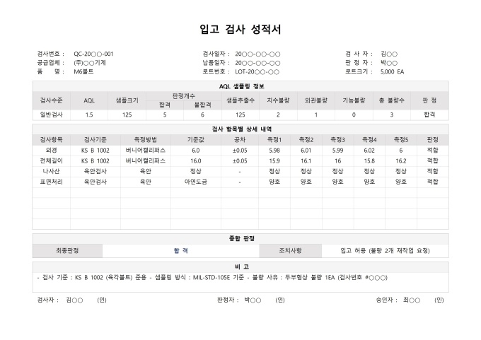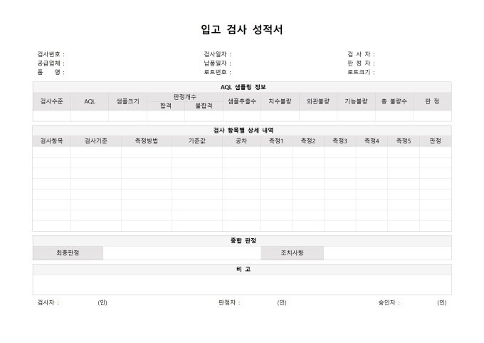 입고 검사 성적서 서식입니다. 입고 검사 성적서는 회사에서 원자재, 부품, 완제품 등 외부로부터 구매하여 입고되는 모든 품목에 대해 품질 기준에 적합한지 여부를 확인하고, 그 결과를 기록하는 문서입니다. 이는 제품 생산 과정의 초기 단계에서부터 품질을 확보하고, 불량 발생 시 책임 소재를 명확히 하며, 공급업체의 품질 수준을 관리하는 데 필수적인 자료로 활용됩니다.