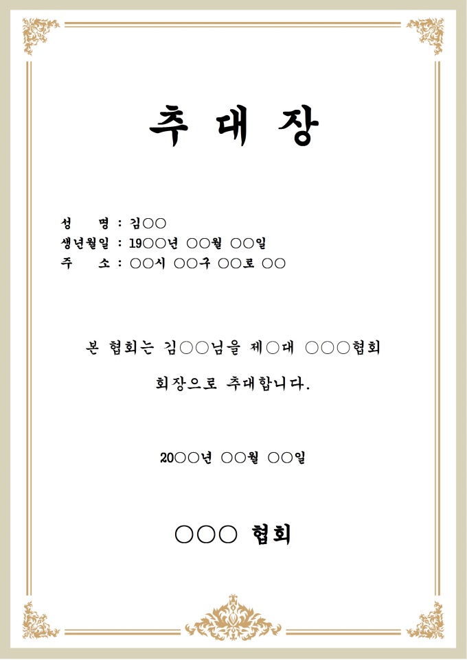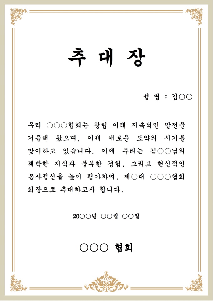 추대장 서식입니다. 추대장은 조직 내 특정 임원이나 위원장, 대표자를 공식적으로 선출하거나 추천하기 위해 작성하는 문서입니다. 본 문서는 대상자의 인적 사항과 추천 사유, 추천 경위 등을 명확하게 기록함으로써 투명하고 공정한 선출 과정을 뒷받침하는 역할을 합니다. 일반, 상세, 심플버전의 3가지 추대장 양식이 포함되어 있습니다.