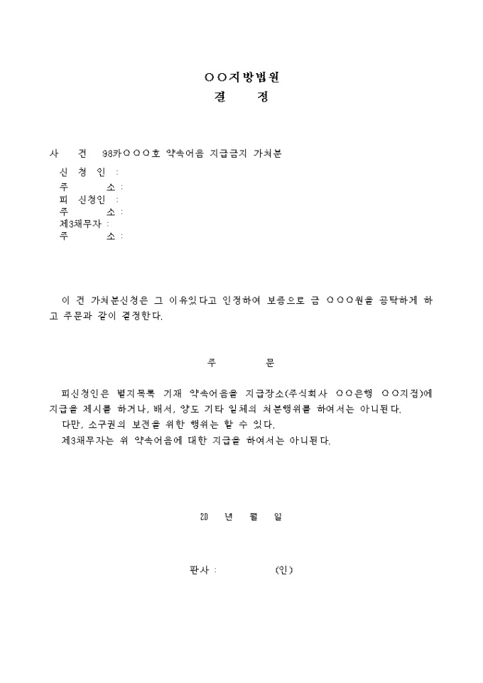 9,000원/월약속어음 지급금지 가처분신청은 그 이유있다고 인정하여 보증으로 금 원을 공탁하게 하고 피신청인은 별지목록 기재 약속어음을 지급장소(주식회사 은행 지점)에 지급을 제시를 하거나, 배서, 양도 기타 일체의 처분행위를 하여 서는 아니된다라는 내용의 결정서입니다.