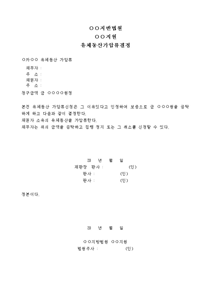 9,000원/월유체동산 가압류신청은 그 이유있다고 인정하여 보증으로 금 원을 공탁하게 하고 채권자 소유의 유체동산을 가압류하며 채무자는 위의 금액을 공탁하고 집행 정지 또는 그 취소를 신청할 수 있다라는 내용의 결정서입니다.