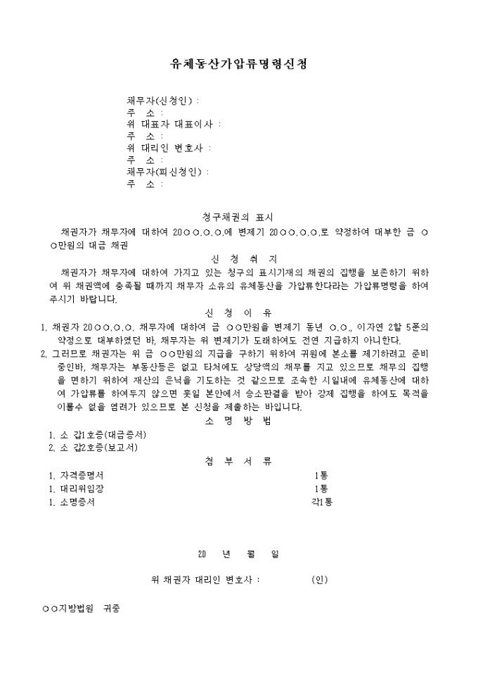 9,000원/월채권자가 채무자에 대하여 가지고 있는 청구의 표시기재의 채권의 집행을 보존하기 위하여 위 채권액에 충족될 때까지 채무자 소유의 유체동산을 가압류한다라는 가압류명령을 하여 주기를 바라는 내용입니다.