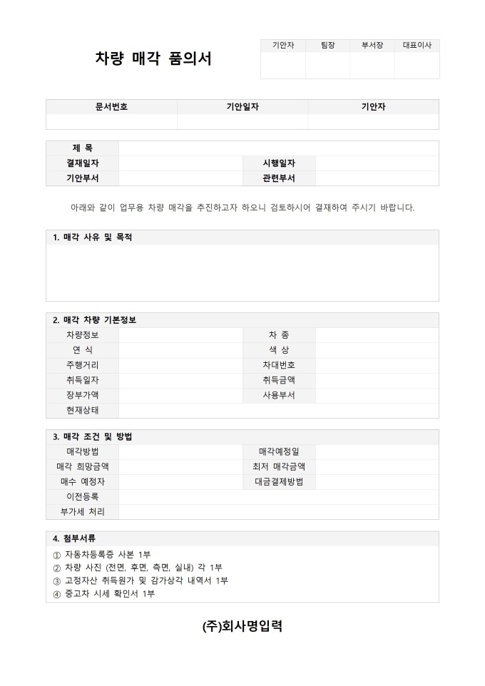 9,000원/월차량 매각 품의서 서식입니다. 차량 매각 품의서는 회사가 보유한 차량을 매각하고자 할 때 내부 승인 절차를 위해 작성하는 공식 문서입니다. 이 품의서에는 차량의 종류, 차량번호, 제조 연도 등 기본적인 차량 정보와 함께 매각 사유, 매각 방식, 예상 매각 금액 및 일정 등이 상세히 기록되어야 합니다.