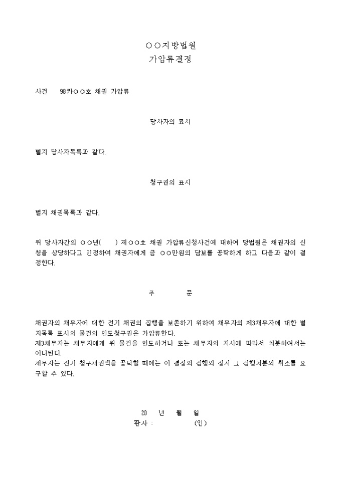 9,000원/월채권 가압류신청사건에 대하여 당법원은 채권자의 신청을 상당하다고 인정하여 채권자에게 금..만원의 담보를 공탁하게 하고 신청사건에 대하여 당법원은 채권자의 신청을 상당하다고 인정하여 채권자에게 금..만원의 담보를 공탁하게 하고 다음과 같이 결정한다하는 내용의 결정서입니다.