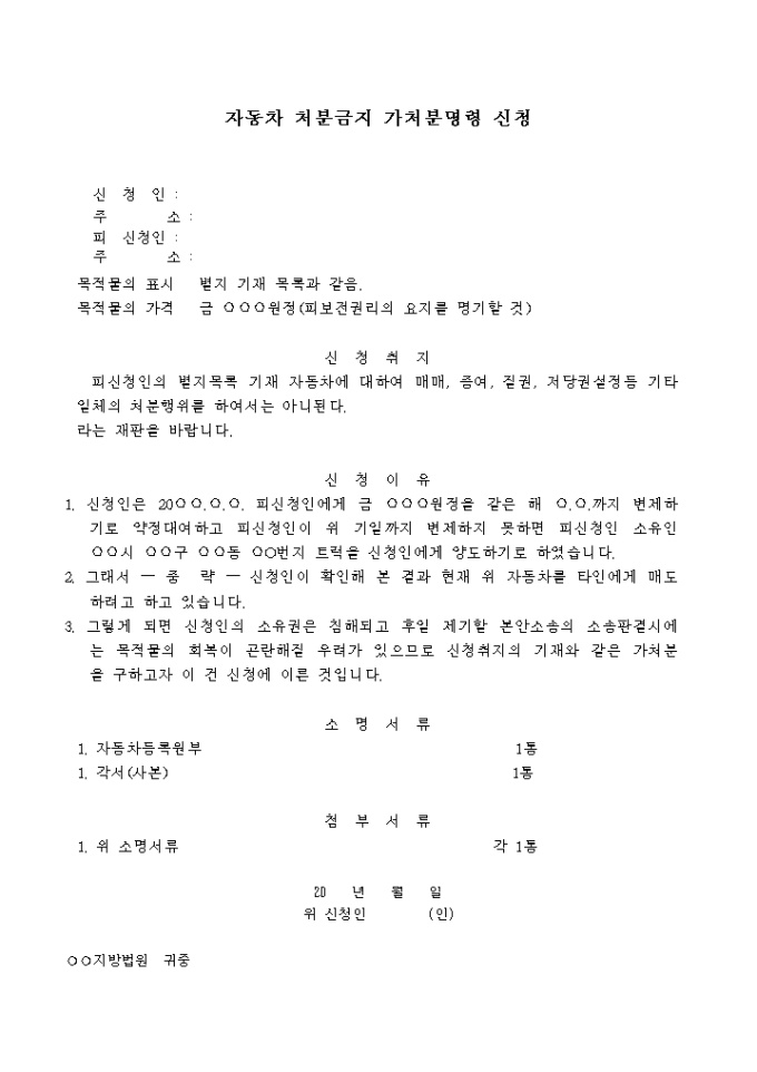 9,000원/월피신청인의 별지목록 기재 자동차에 대하여 매매, 증여, 질권, 저당권설정등 기타 일체의 처분행위를 하여 서는 아니된다라는 재판을 바라는 내용입니다.