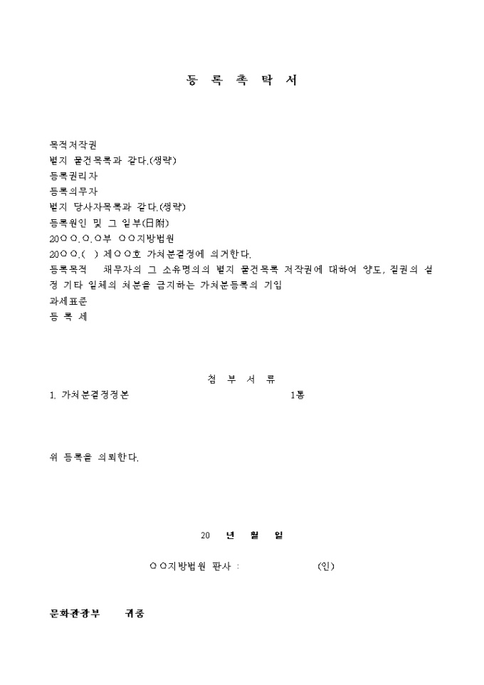 9,000원/월채무자의 그 소유명의의 별지 물건목록 저작권에 대하여 양도, 질권의 설정 기타 일체의 처분을 금지하는 가처분등록 초탁하는 내용입니다.