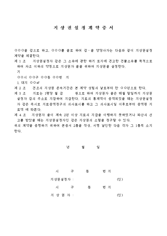 9,000원/월견고한 건물 소유를 위한 지상권설정계약증서 양식으로 모두 4개의 조항으로 구성되어 있습니다.