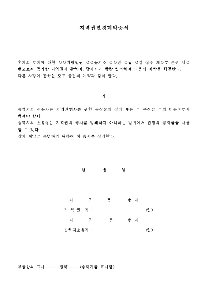 토지에 대한 등기한 지역권에 관하여 , 당사자가 쌍방 협의하여 지역권 변경 계약을 할 때 사용하는 양식입니다.