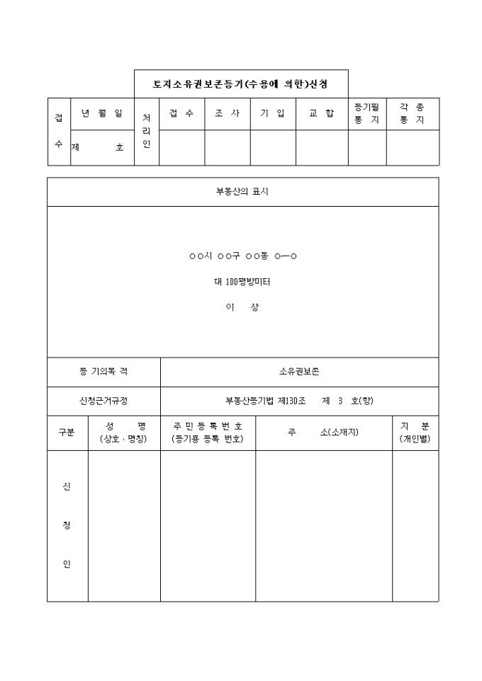 9,000원/월토지소유권보존등기(수용에의한)신청서 입니다.
