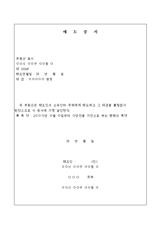 위 부동산은 매도인의 소유인바 귀하에게 매도하고 그 대금을 틀림없이 받았으므로 이 증서에 기명 날인한다.