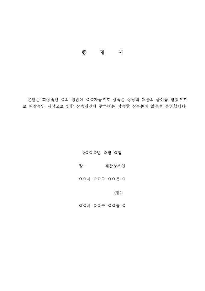 9,000원/월증명서(특별수익자제외상속) 입니다. 본인은 피상속인 ○의 생전에 ○○자금으로 상속분 상당의 재산의 증여를 받았으므로 피상속인 사망으로 인한 상속재산에 관하여 는 상속할 상속분이 없음을 증명합니다. ...