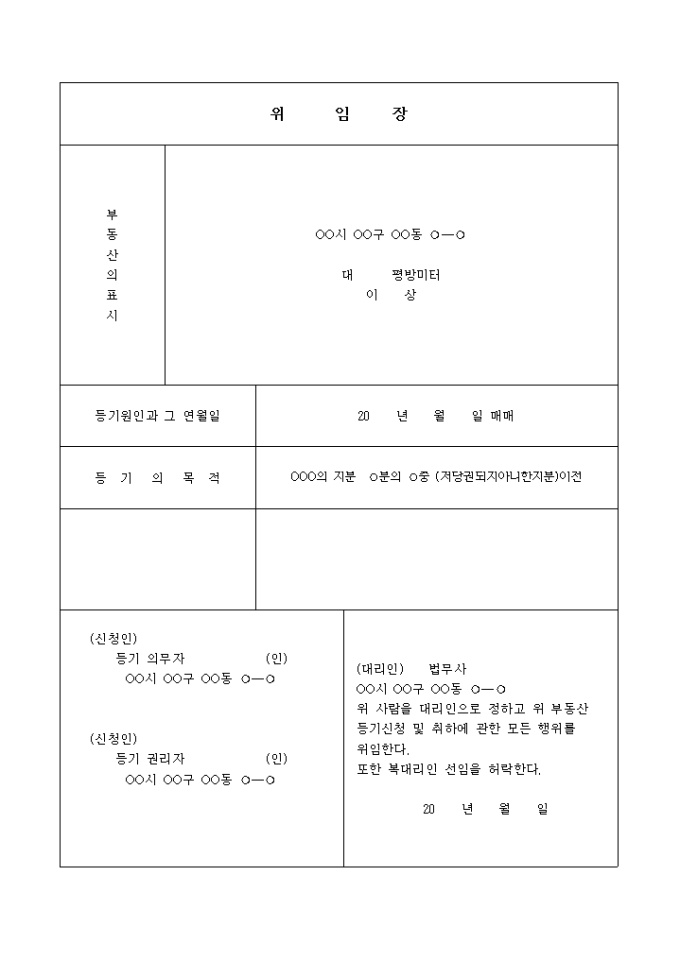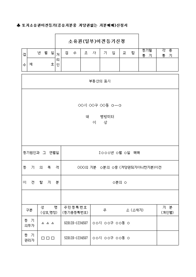 9,000원/월토지소유권이전등기(공유지분중저당권없는지분매매)신청서 입니다. 등 기 의 목 적 : OOO의 지분 분의 중 (저당권되지아니한지분)이전 1. 부동산표시란에 2개 이상의 부동산을 기재하는 경우에는 그 부동산의 일련번호를 기재하여 야 합니다. 2. 신청인란등 해당란에 기재할 여백이 없을 경우에는 별지를 이용합니다. 3. 등기신청수수료 상당의 등기수입증지를 이 난에 첩부합니다.