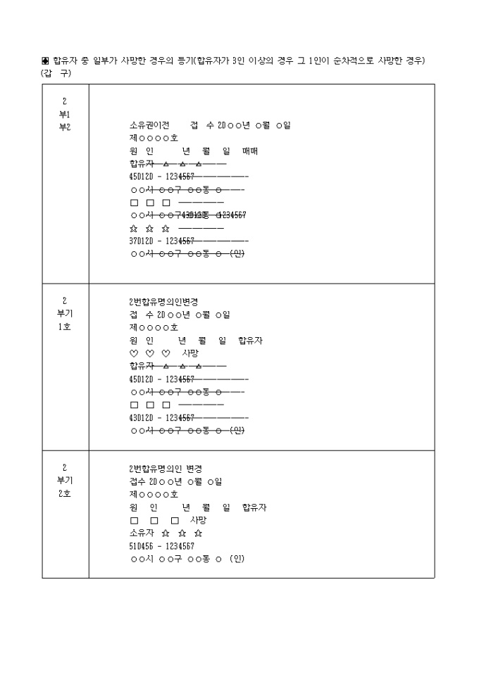 합유자중일부가사망한경우의등기(합유자가3인이상의경우그1인이순차적으로사망한경우) 입니다.