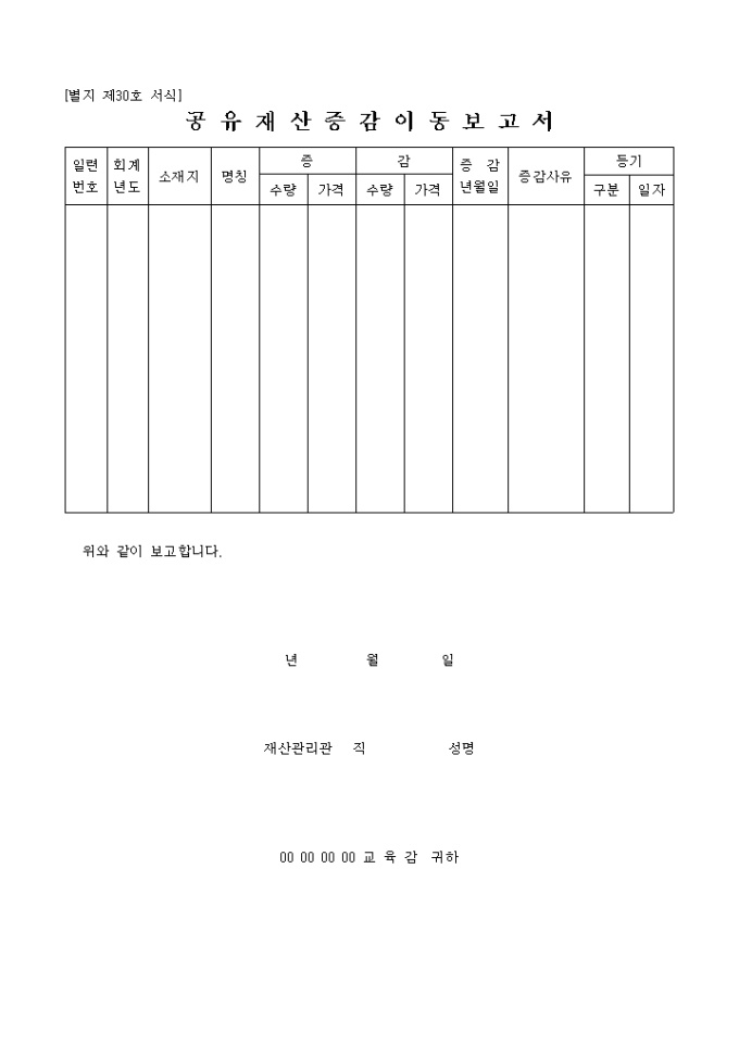 9,000원/월별지 제30호 서식으로 공유재산의 증감이동을 기록한 양식입니다.