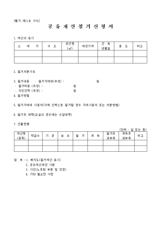 9,000원/월별지 제11호서식으로 재산의 표시, 철거처분사유, 철거내용, 철거방법, 철거자재다 사용처, 철거후 대책, 건물현황을 기록하는 공유재산철거신청서입니다.