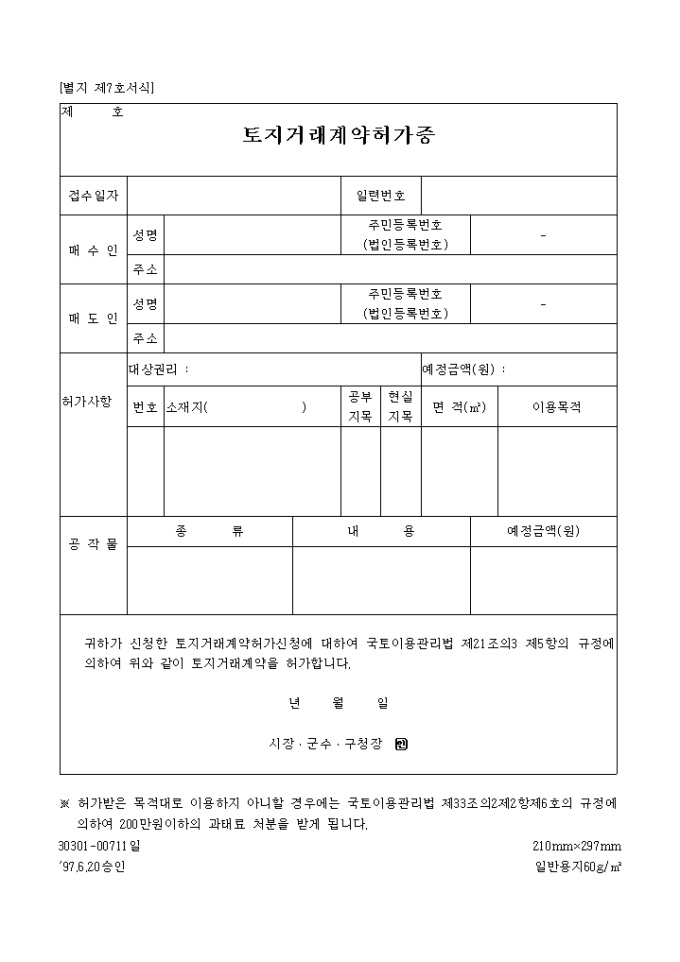 9,000원/월귀하가 신청한 토지거래계약허가신청에 대하여 국토이용관리법 제21조의3 제5항의 규정에 의하여 토지거래계약을 허가할 때 쓰이는 토지거래 계약허가증 양식입니다.