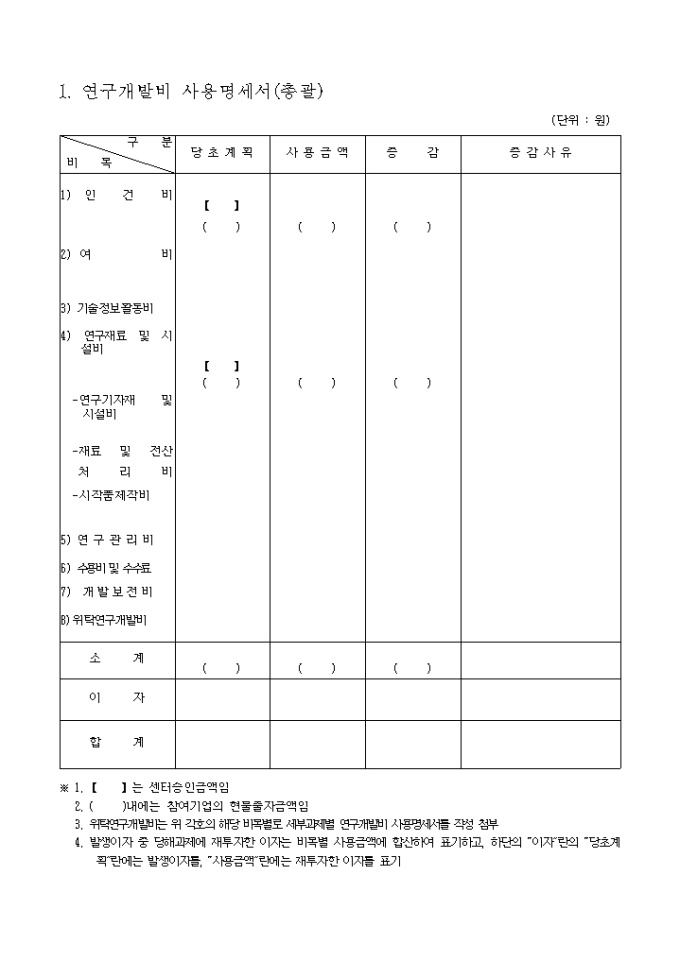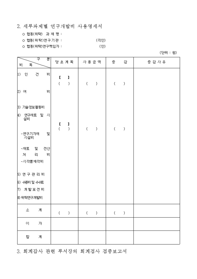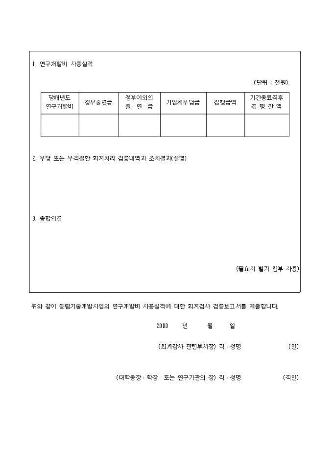 사업계획서와집행실적과의대비표 양식입니다. 농림부 농림기술개발사업 실시요령 제29조 제1항에 의하여 위 연구과제에 대한 사업계획서와 집행실적과의 대비표를 첨부와 같이 보고하실때 사용하는 양식입니다. 첨 부 1. 사업비 사용명세서 1부 2. 회계검사 공인회계사의 의견서 1부(해당시 추후보고) 3. 회계감사 관련 부서장의 회계검사 검증보고서 1부 [목 차] 1. 연구개발비 사용명세서(총괄) 2. 세부과제별 연구개발비 사용명세서 3