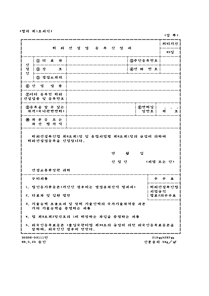 9,000원/월해외건설촉진법 제6조제1항 및 동법시행령 제6조제1항의 규정에 의하여 해외 건설업 등록을 하고자 할 때 쓰이는 해외 건설업 등록신청서 양식입니다.