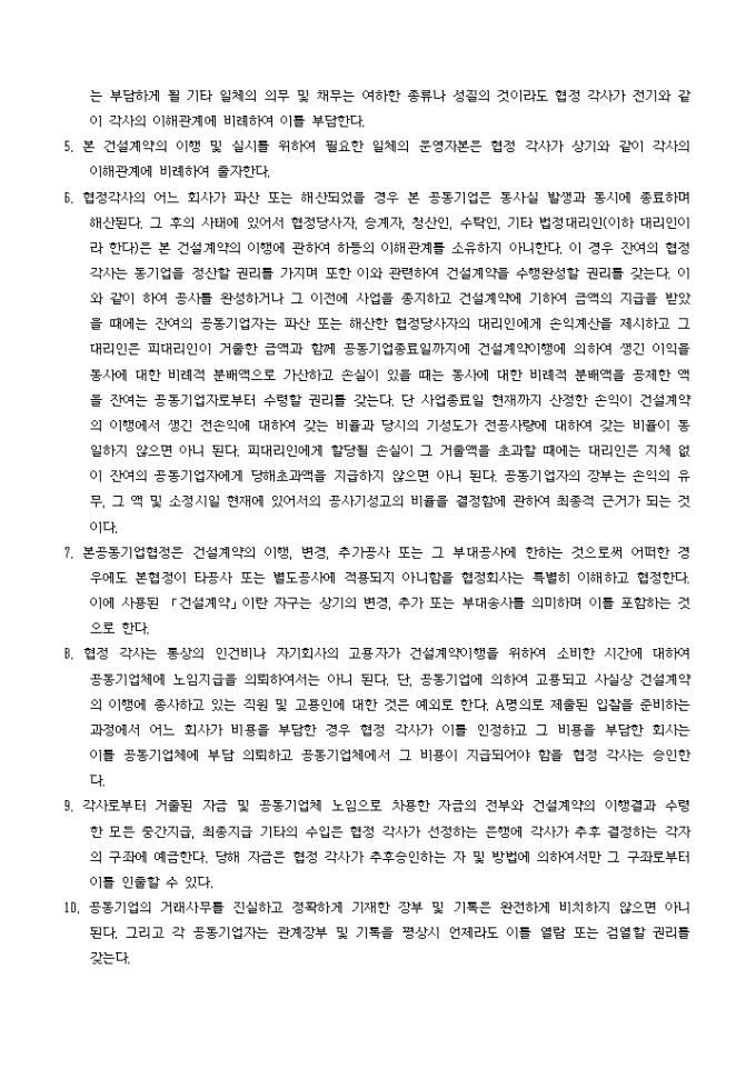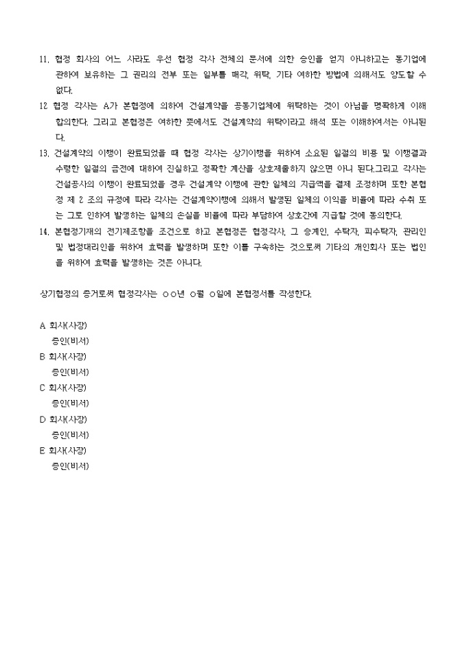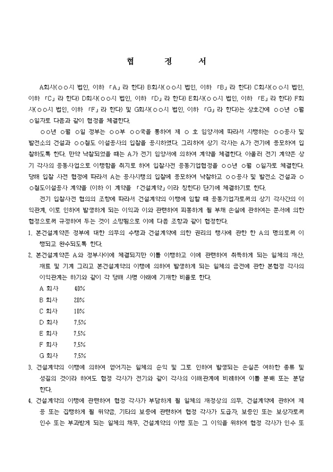 공동공사의 수급을 전제로 한 사전협정서 예제 입니다. A회사(○○시 법인, 이하 「A」라 한다) B회사(○○시 법인, 이하 「B」라 한다) C회사(○○시 법인, 이하 「C」라 한다) D회사(○○시 법인, 이하 「D」라 한다) E회사(○○시 법인, 이하 「E」라 한다) F회사(○○시 법인, 이하 「F」라 한다) 및 G회사(○○시 법인, 이하 「G」라 한다)는 상호간에 ○○년 ○월 ○일자로 다음과 같이 협정을 체결한다. ...