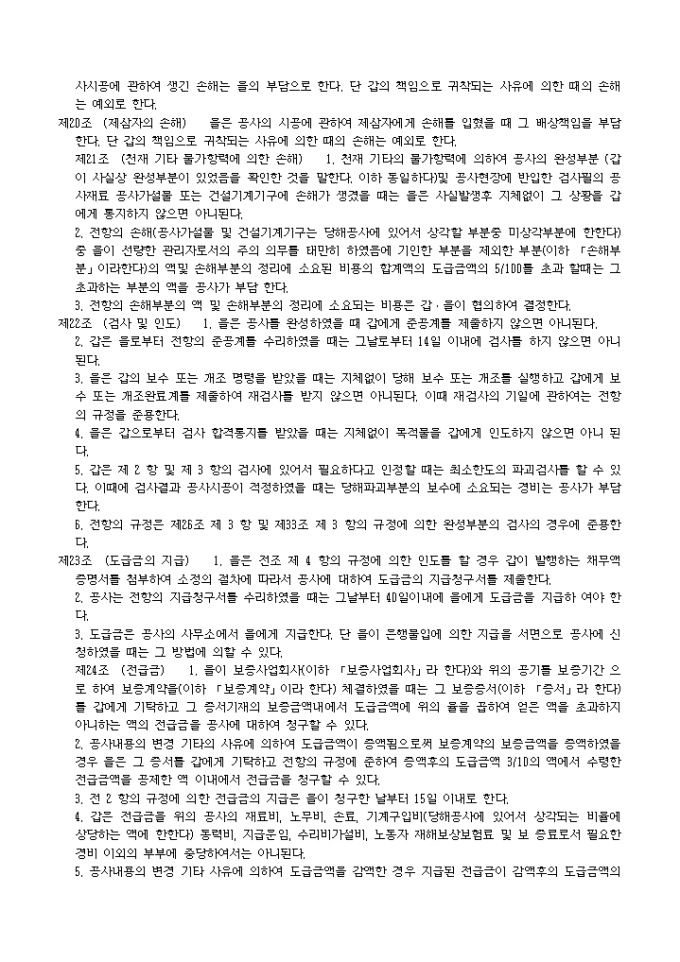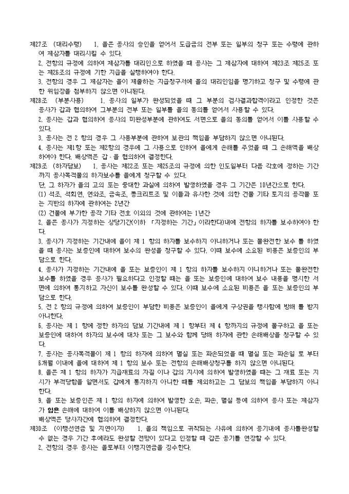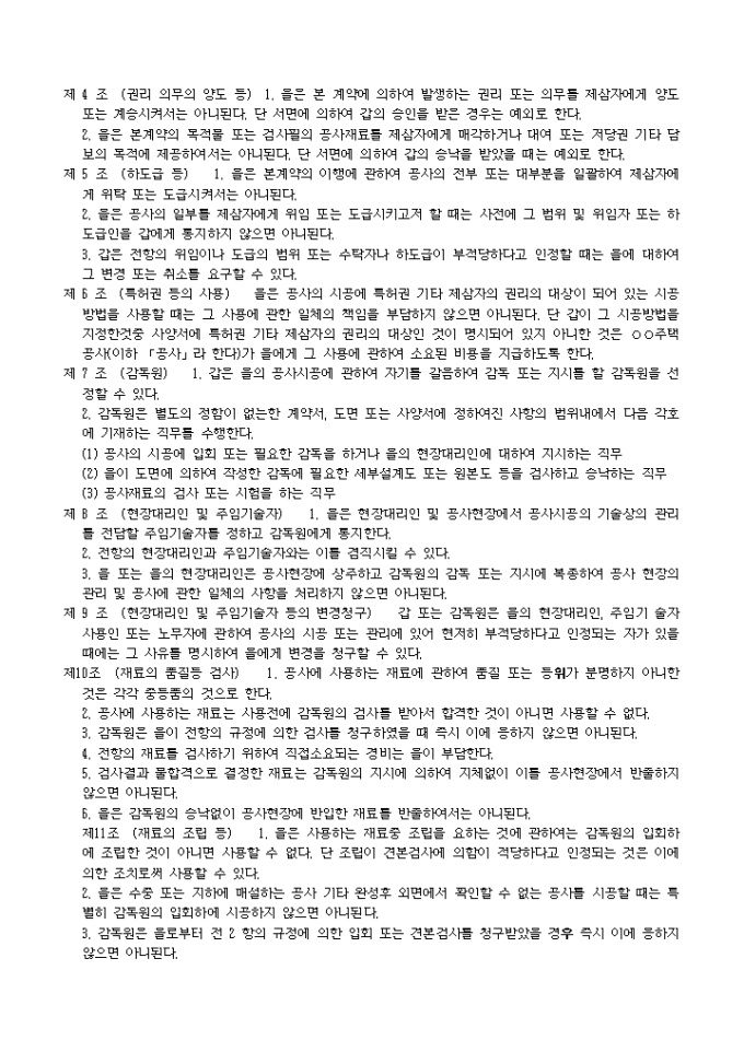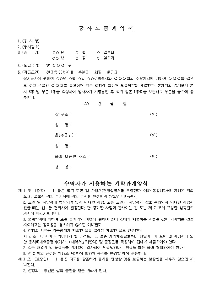 상기공사에 관하여 년 월 일 주택공사와 와의 수탁계약에 기하여 를 갑으로 하고 수급인 를 을로하여 다음 조항에 의하여 도급계약을 체결한다. 본계약의 증거로서 본서 3통 및 부본 1통을 작성하여 당사자가 기명날인 후 각자 정본 1통씩을 보관하고 부본을 공사에 송부한다.