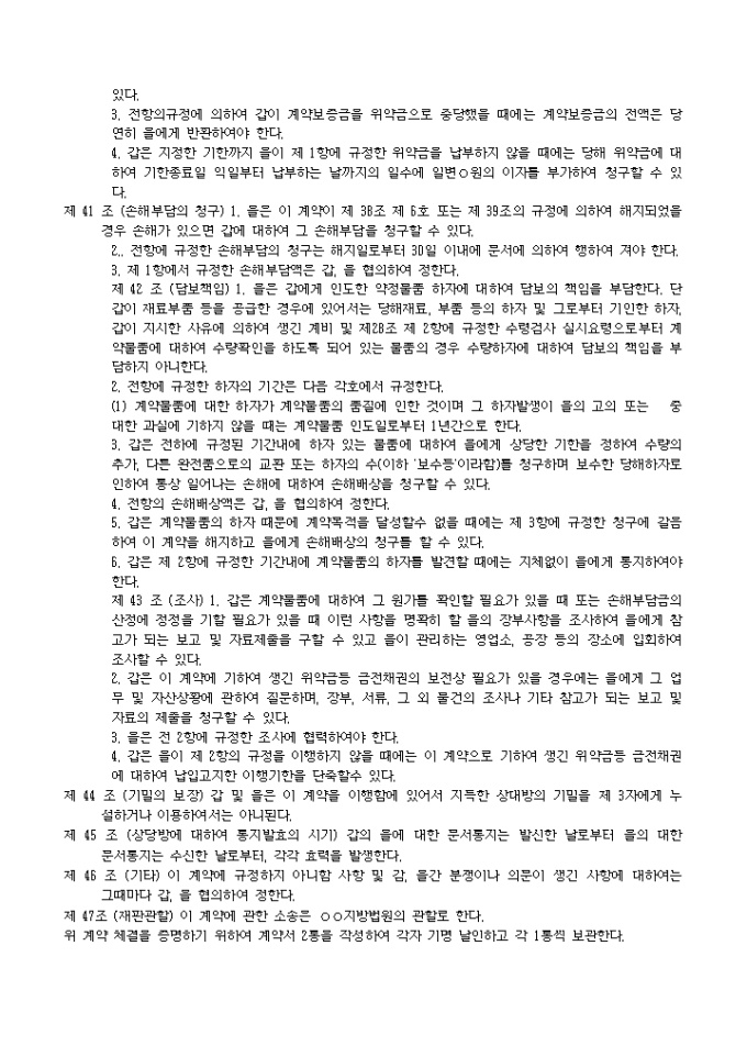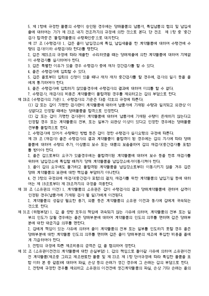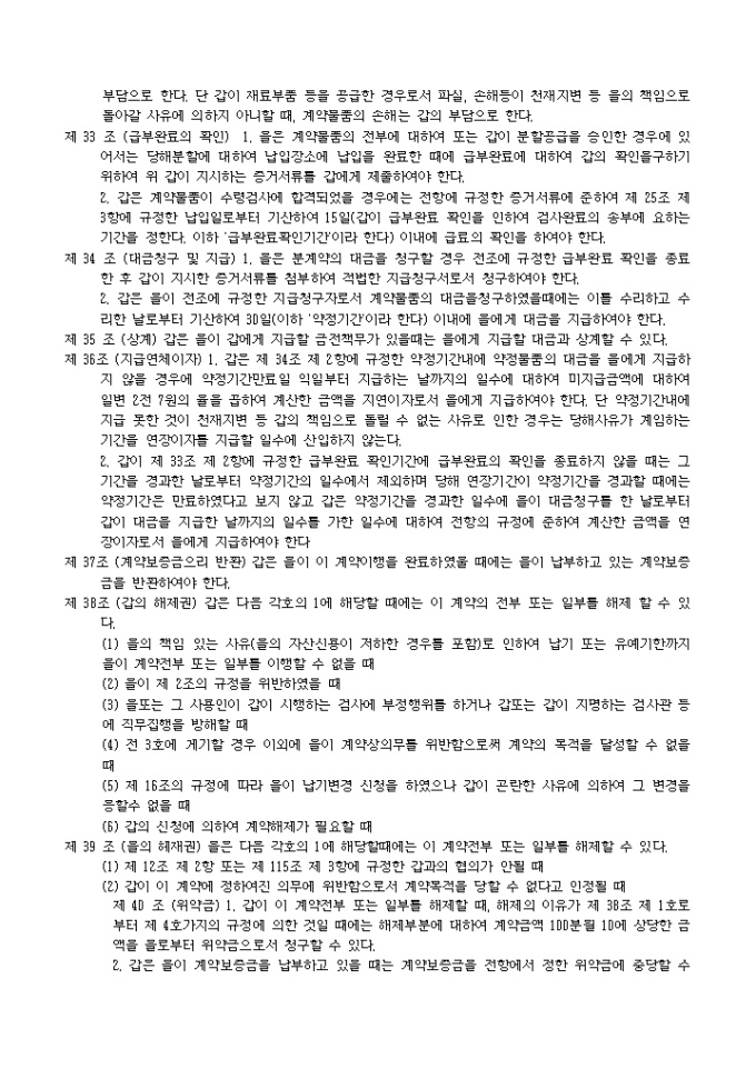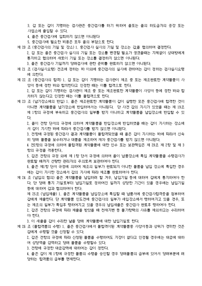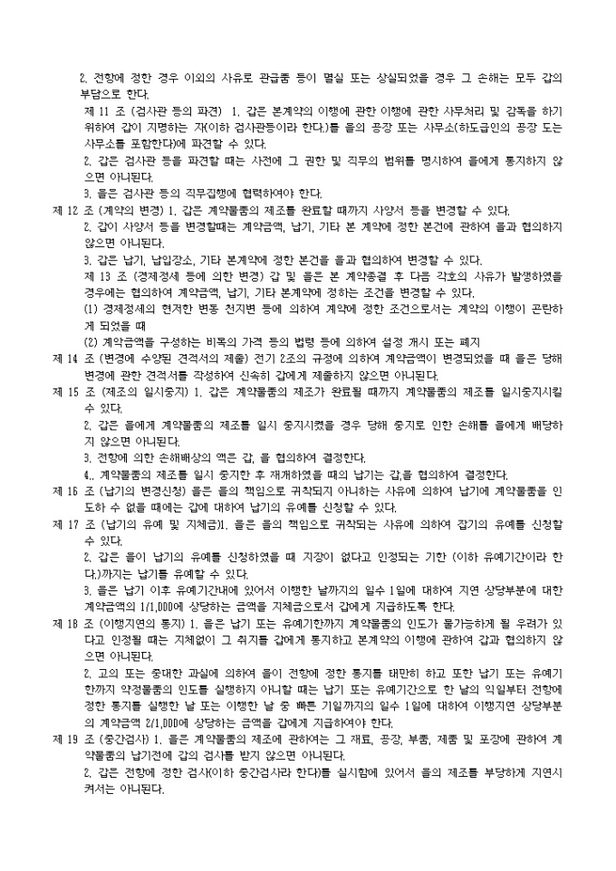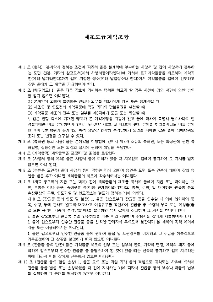 9,000원/월제조도급계약조항(관청용) 예제 입니다. 제 1 조 (총칙) 본계약에 정하는 조건에 따라서 을은 본계약에 부속하는 사양서 및 갑이 사양서에 첨부하는 도면, 견본, 기타의 참고도서(이하 사양서등이라한다.)에 기하여 표기계약물품을 제조하며 계약기한(이하 납기라한다)까지 갑이 지정한 장소(이하 납입장소라 한다)에서 계약물품을 갑에게 인도하고 갑은 을에게 그 대금을 지급하여 야 한다. 제 2 조 (채권양도) 1. 을은 다음 각호에 기재하는 행위를 하고자 할