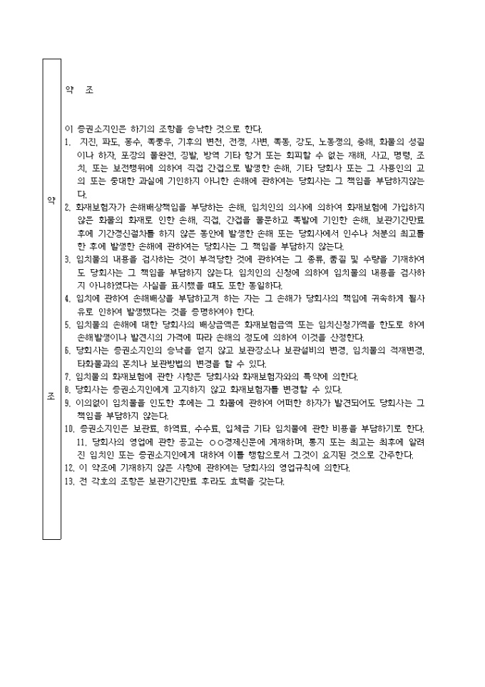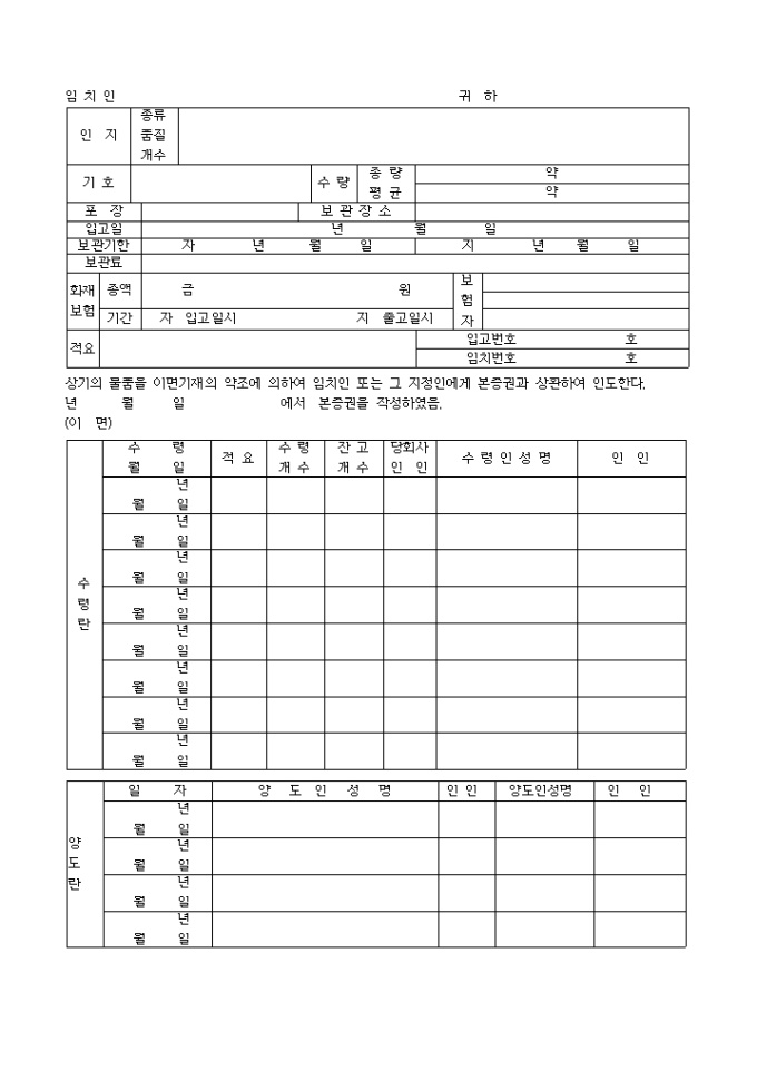 창고증권 입니다. 상기의 물품을 이면기재의 약조에 의하여 임치인 또는 그 지정인에게 본증권과 상환하여 인도한다. 년 월 일 에서 본증권을 작성하였음. ...