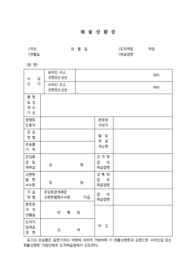 화물상환증 예제 입니다. 제1조 상점이 운송인수를 했을 경우에 있어서, 철도 궤도 등을 이용할 때는 그 운송기관이 행하 는 운송에 관하여 는, 그 운송기관에 적용되는 법령, 그 운송기관이 정한 규칙이나 또는 약관 및 그 운송기관간에 행하고 있는 관습에 의한다. 제2조 1. 표기의 운송품의 운송중지, 반송 또는 전송 기지의 처분을 청구하고자 하는 자는 이 화 물상환증을 첨부하여 지시서를 제출하기로 한다.