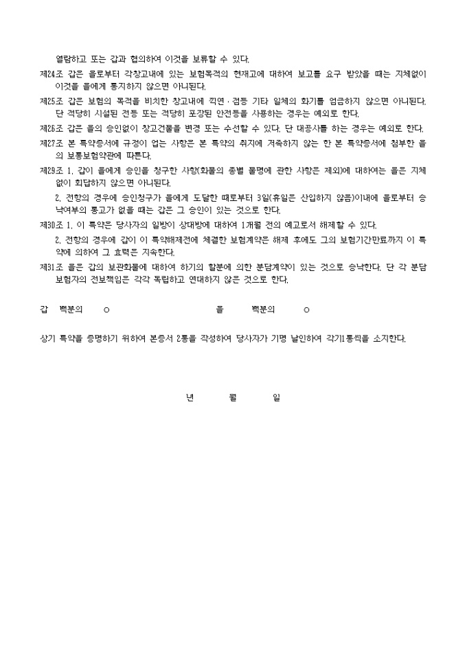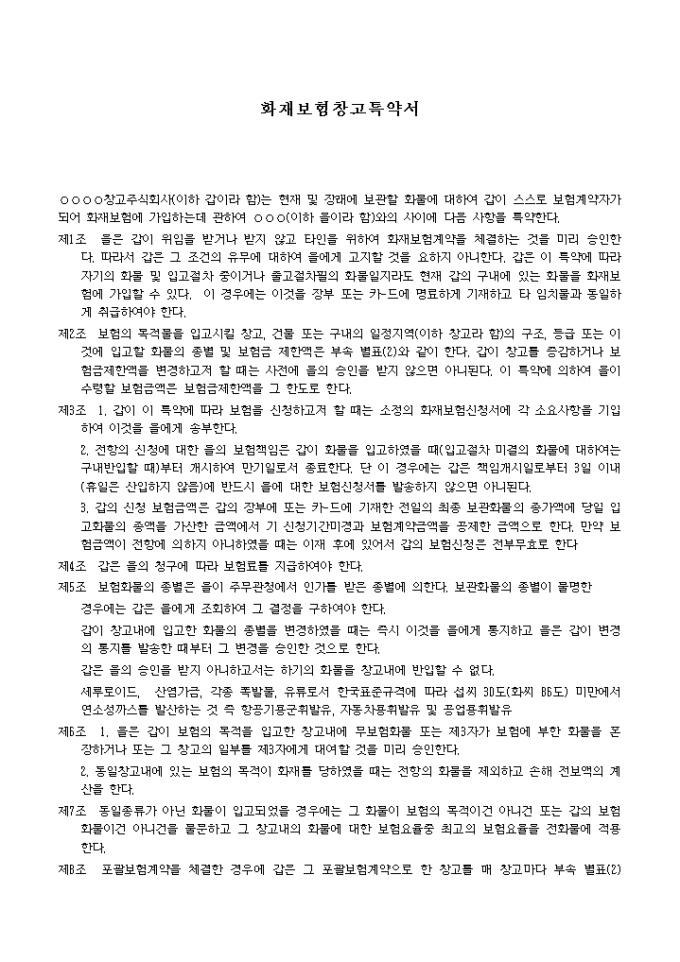 9,000원/월화재보험창고특약서 예제 입니다. 창고주식회사(이하 갑이라 함)는 현재 및 장래에 보관할 화물에 대하여 갑이 스스로 보험계약자가 되어 화재보험에 가입하는데 관하여 (이하 을이라 함)와의 사 이에 다음 사항을 특약한다. 제1조 을은 갑이 위임을 받거나 받지 않고 타인을 위하여 화재보험계약을 체결하는 것을 미리 승인한 다. 따라서 갑은 그 조건의 유무에 대하여 을에게 고지할 것을 요하지 아니한다. 갑은 이 특약에 따라 자기의 화물 및 입
