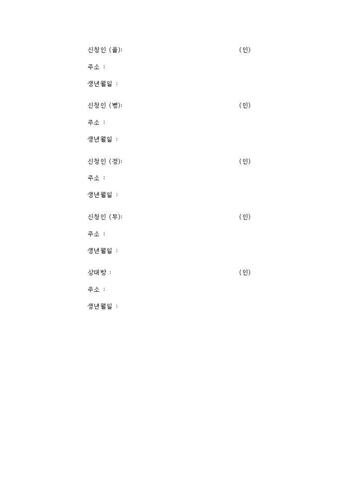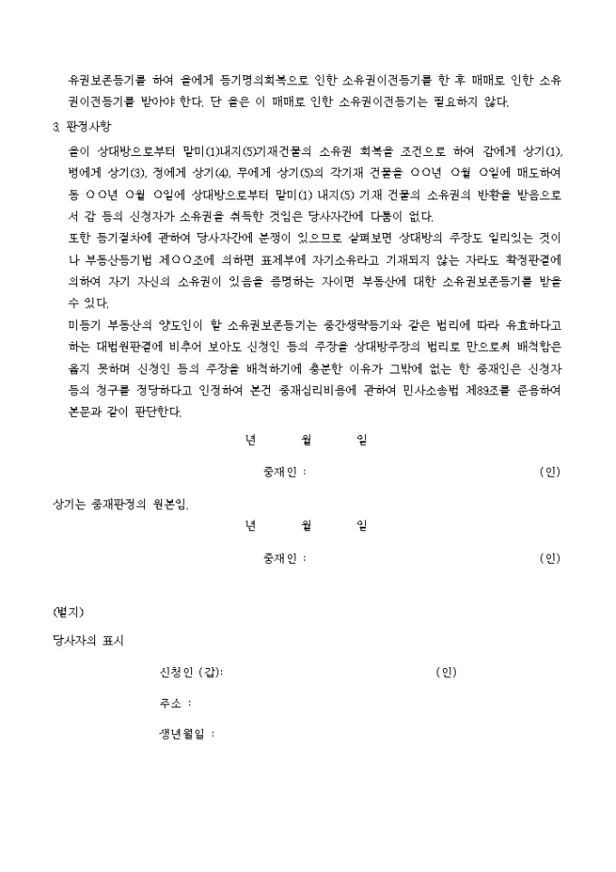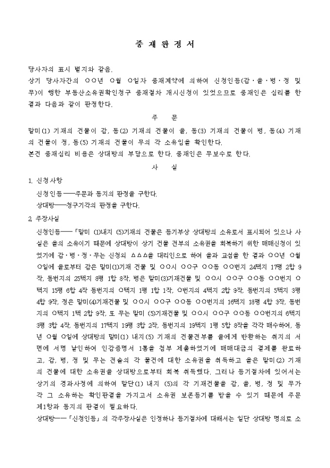 9,000원/월중재판정서 예제 입니다. 당사자의 표시 별지와 같음. 상기 당사자간의 ○○년 ○월 ○일자 중재계약에 의하여 신청인등(갑 을 병 정 및 무)이 행한 부동산소유권확인청구 중재절차 개시신청이 있었으므로 중재인은 심리를 한 결과 다음과 같이 판정한다. ...