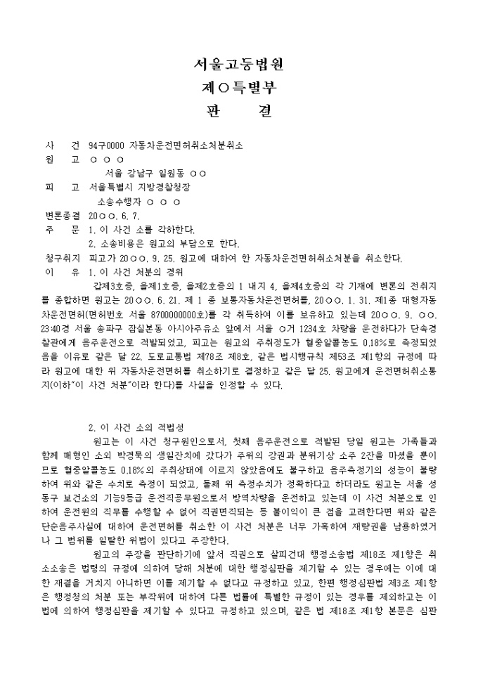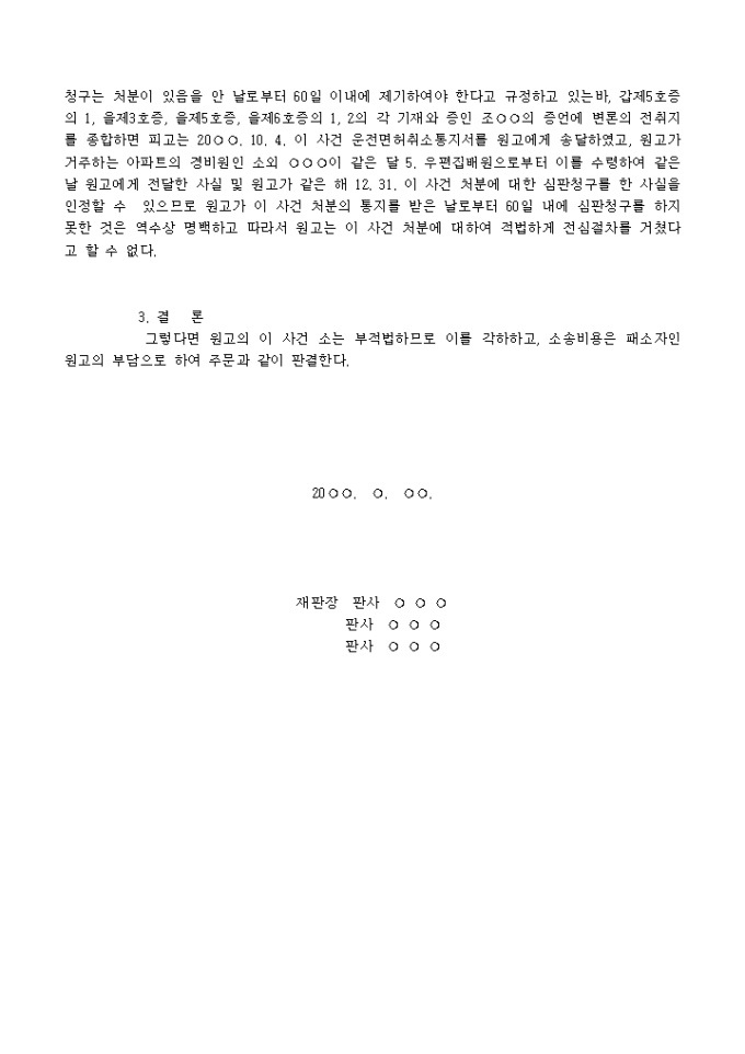 재판에 대한 판결문 양식입니다. 판결내용 : 자동차운전면허취소처분취소 사건에 대해 원고의 이 사건 소는 부적법하므로 이를 각하하고, 소송비용은 패소자인 원고의 부담으로 하여 주문과 같이 판결한다.