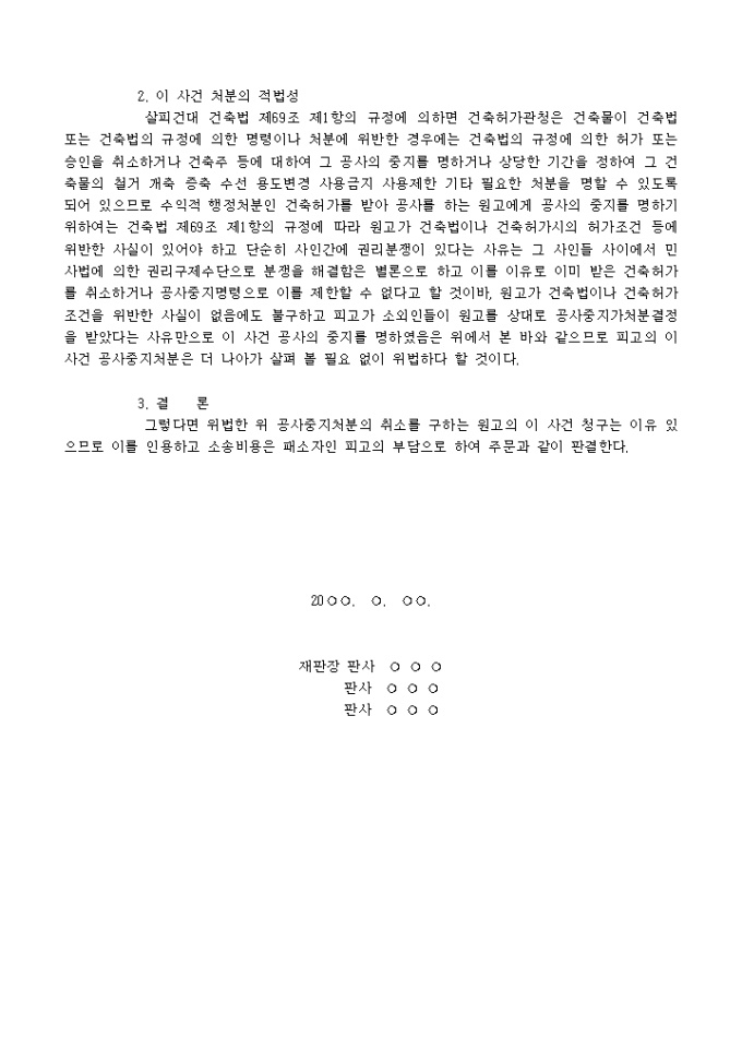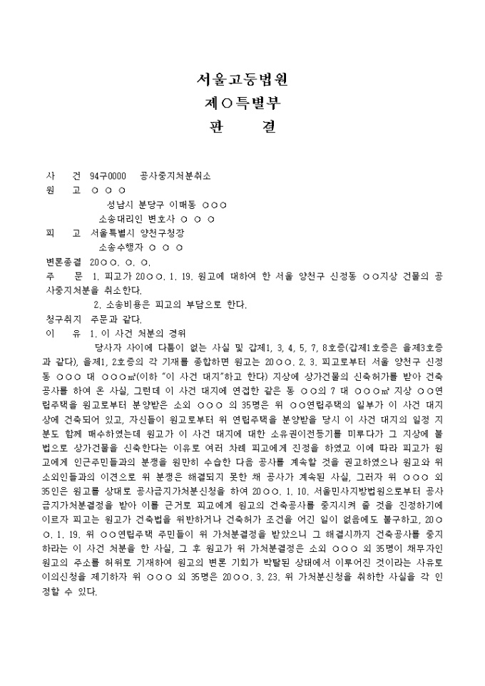 9,000원/월재판에 대한 판결문 양식입니다. 판결내용 : 공사중지처분취소 사건에 대하여 위법한 위 공사중지처분의 취소를 구하는 원고의 이 사건 청구는 이유 있으므로 이를 인용하고 소송비용은 패소자인 피고의 부담으로 하여 주문과 같이 판결한다.
