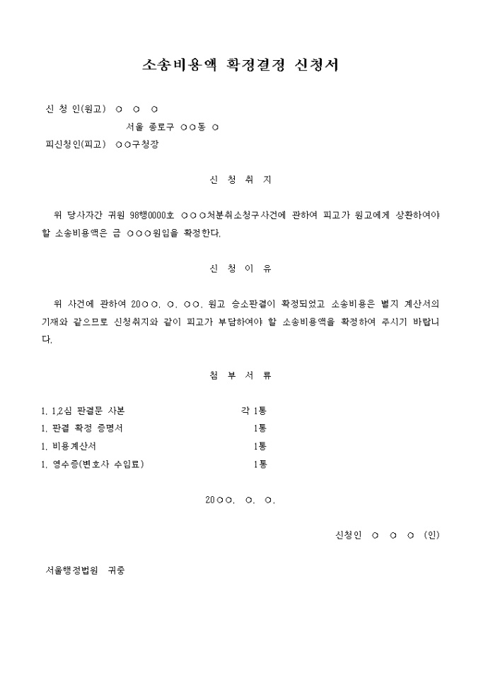 당사자간 ○○○처분취소청구사건에 관하여 피고가 원고에게 상환하여야 할 소송비용에 대한 확정 결정을 신청할 때 사용하는 양식입니다.