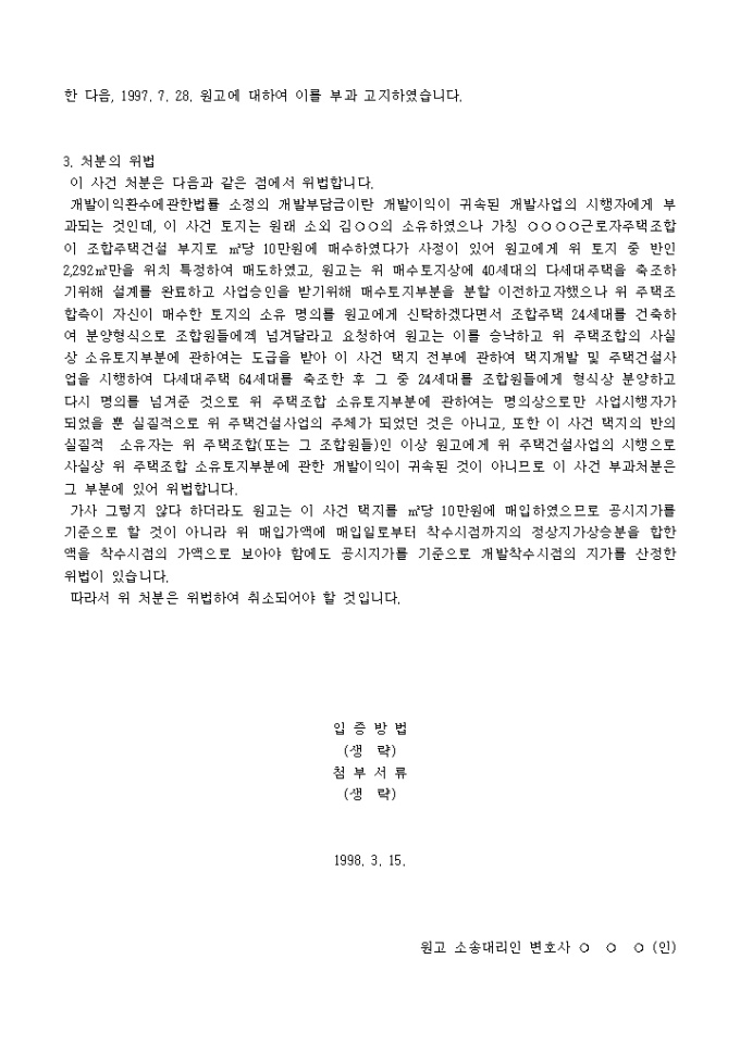 개발부담금부과처분에 대하여 개발이익의 귀속자가 아니라는 이유로 부과처분의 취소를 구하는 소장양식입니다.