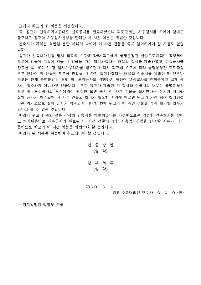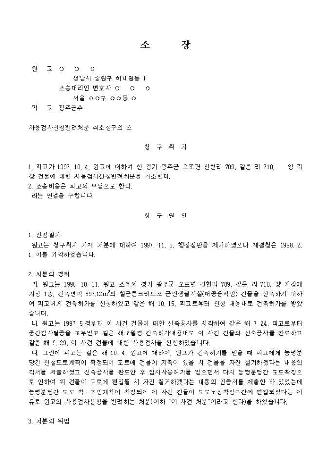 사용검사신청반려처분에 대하여 반려사유가 위법하다는 이유로 처분취소를 구하는 소장양식입니다.