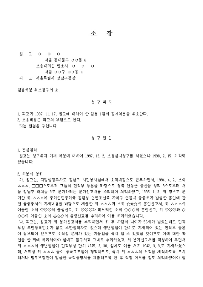 공무원에 대한 감봉처분취소를 요청하는 소장 양식입니다.