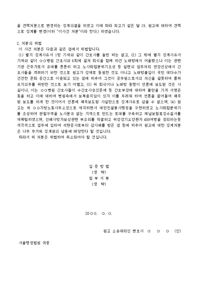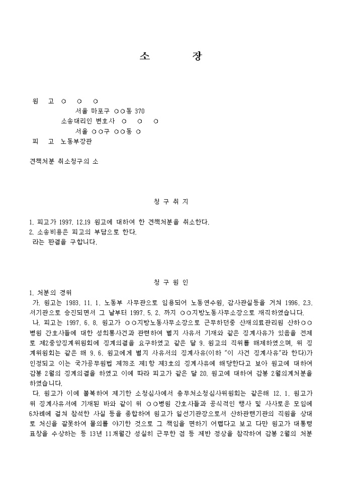 9,000원/월공무원에 대한 견책처분취소를 요청하는 소장 양식입니다.