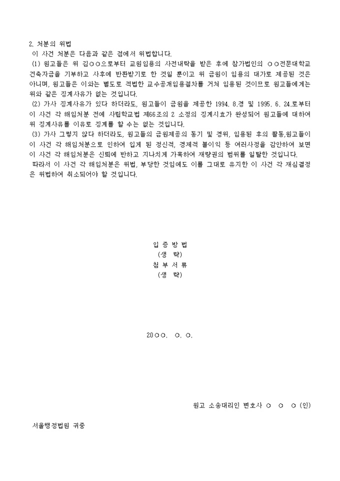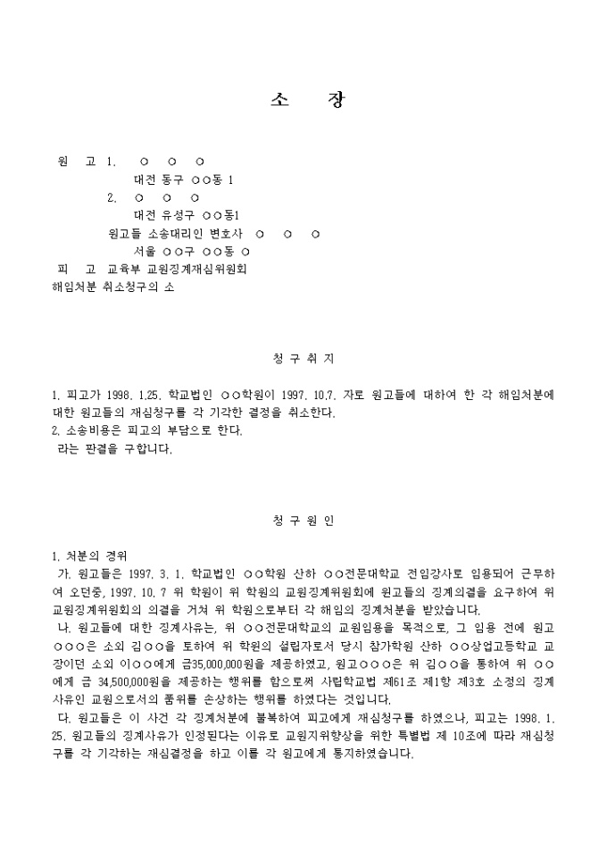 사립학교 교원에 대한 징계처분에 관한 소장 양식입니다.