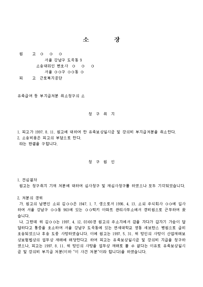 9,000원/월근로복지공단의 처분에 대하여 유족보상일시금 등 부지급처분을 다투는 (산재보험 관련)소장양식입니다.