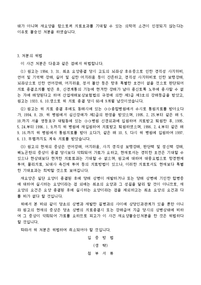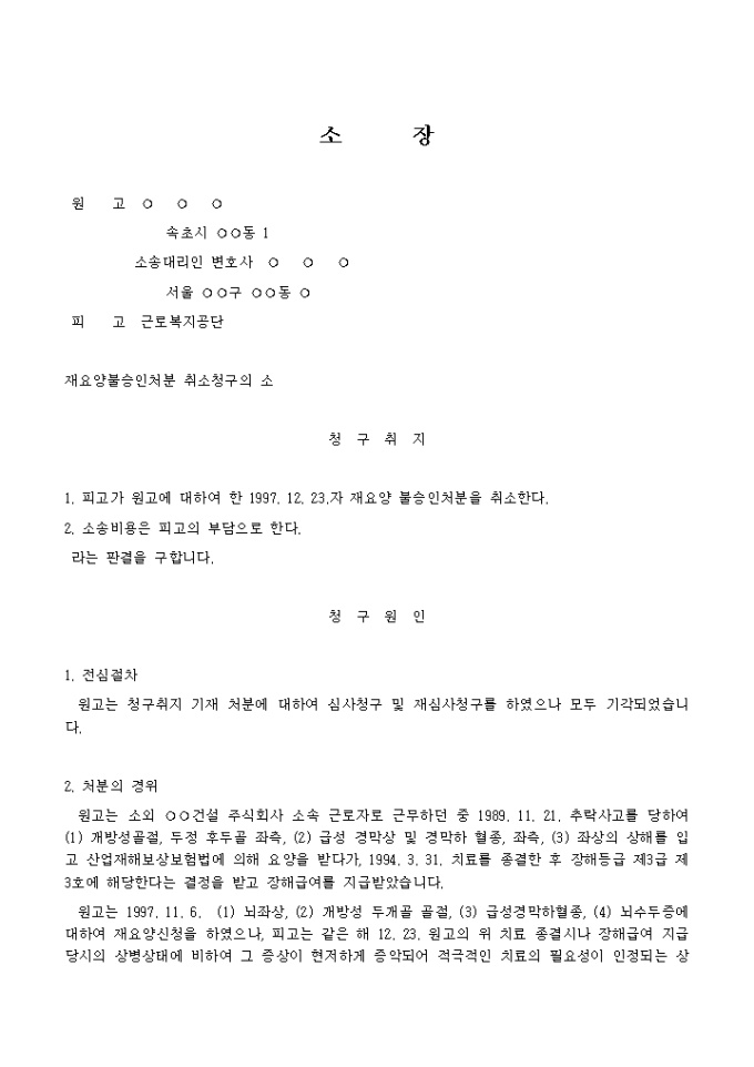 9,000원/월근로복지공단의 처분에 대하여 재요양 불승인처분을 다투는 (산재보험 관련)소장 양식입니다.