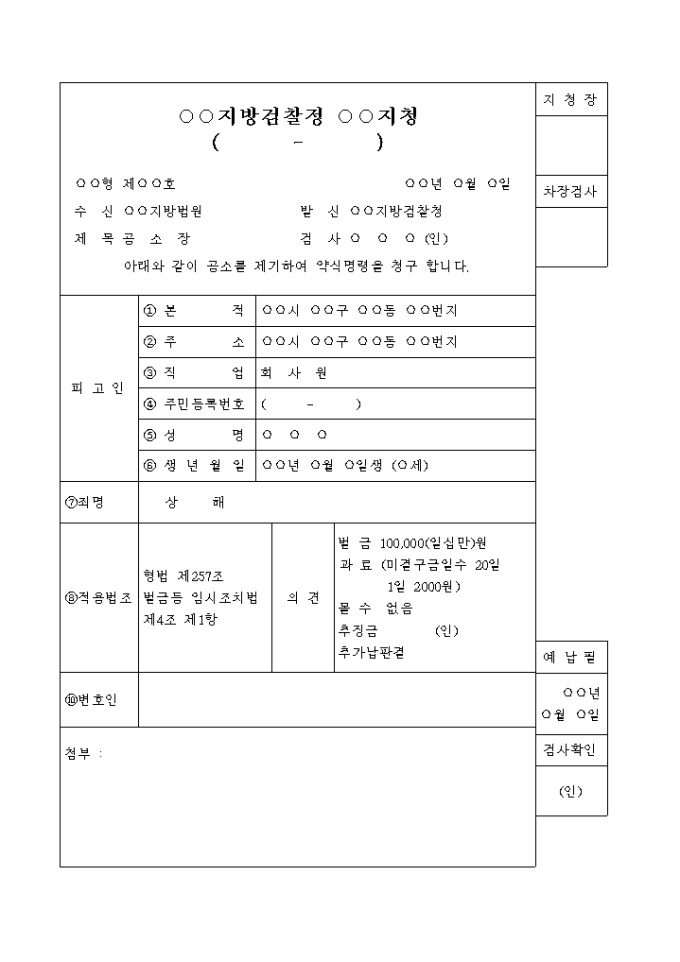 9,000원/월공소장(약식명령청구) 입니다. 수 신 지방법원 발 신 지방검찰청 제 목 공 소 장 검 사 (인) 아래와 같이 공소를 제기하여 약식명령을 청구 합니다. ...