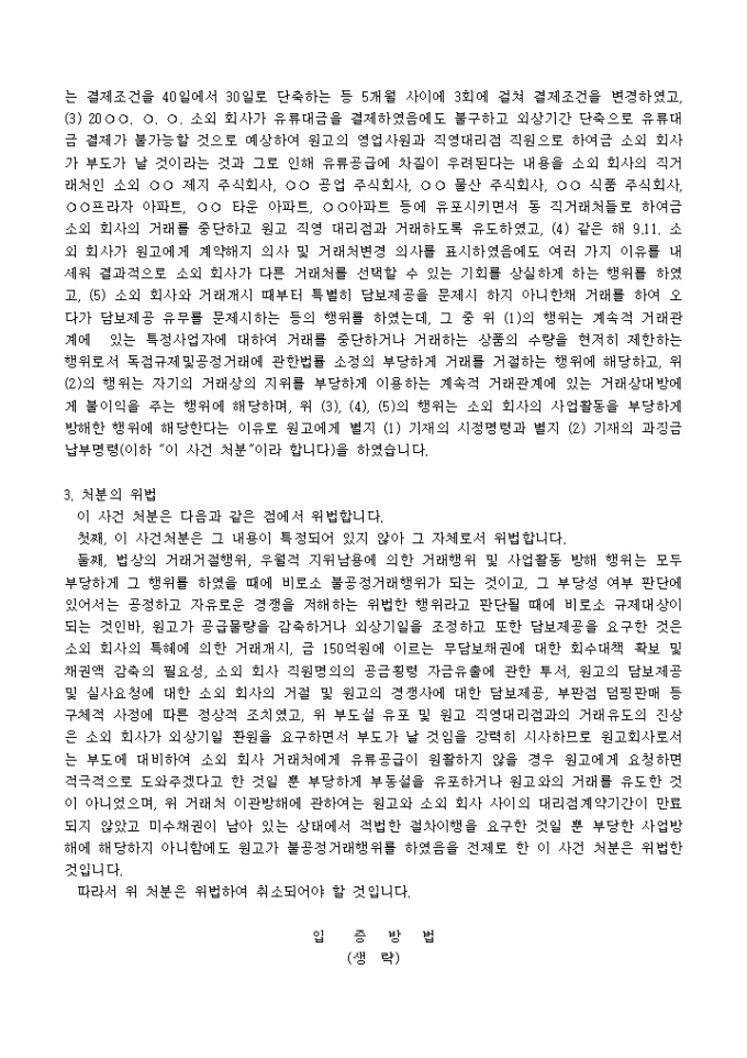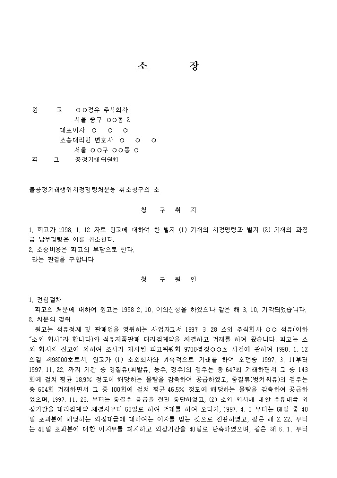 불공정거래행위시정명령처분등 취소청구의 소장양식입니다.
