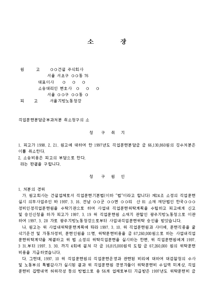 소장(직업훈련분담금부과처분 취소청구의 소)
