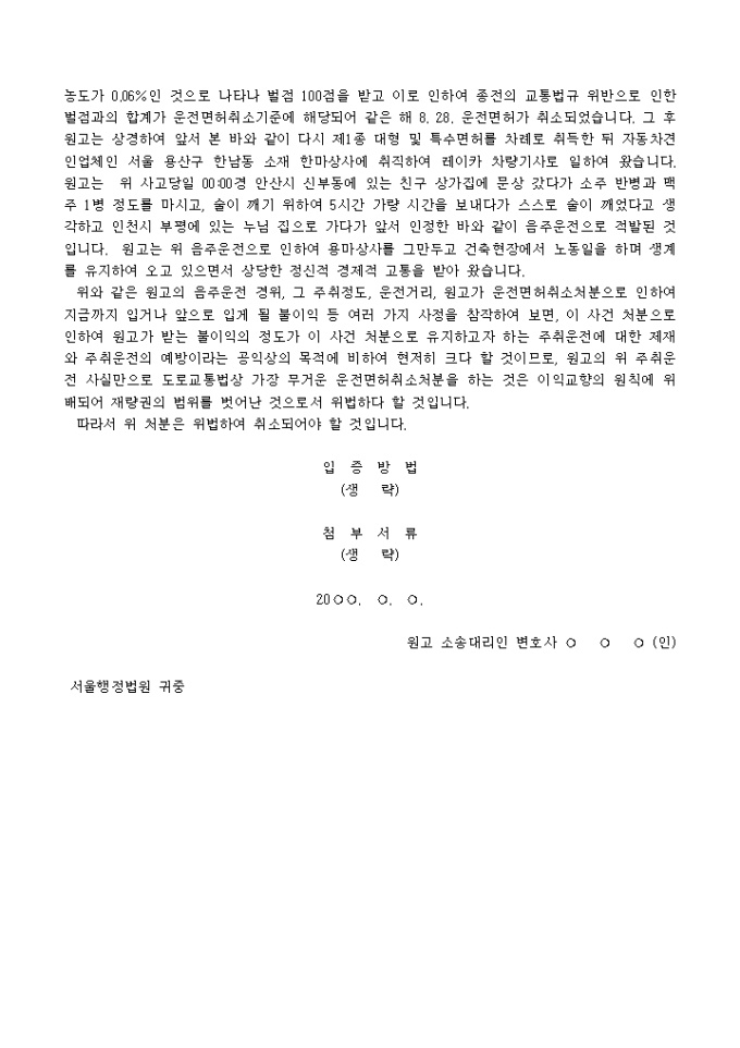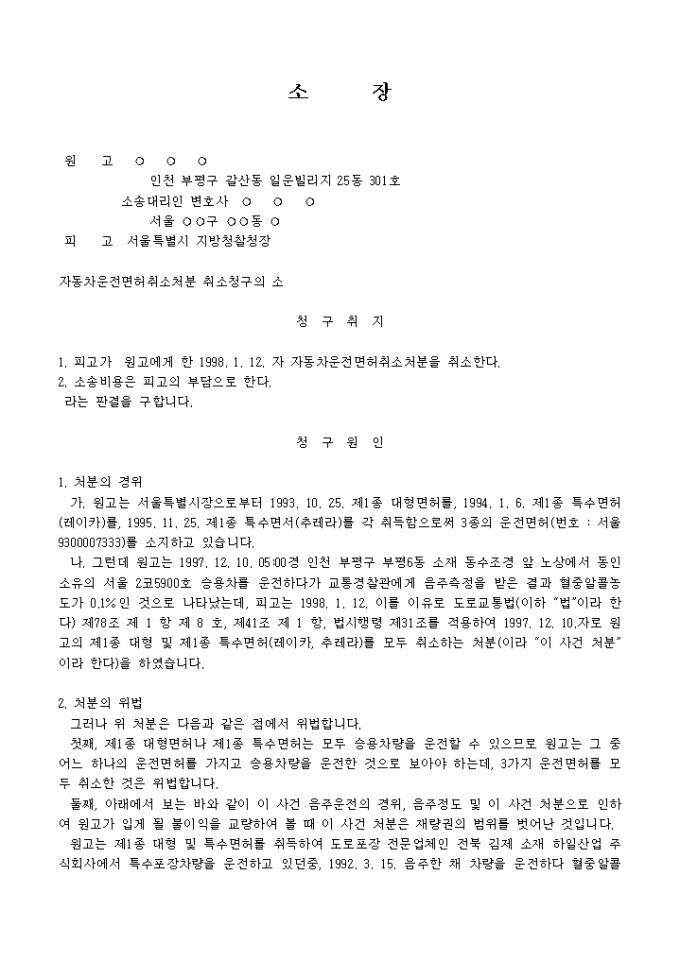 9,000원/월운전면허취소처분에 대하여 관련 면허 전부를 취소함은 위법하고 재량남용의 위법이 있다는 이유로 처분취소를 구하는 소장양식입니다.