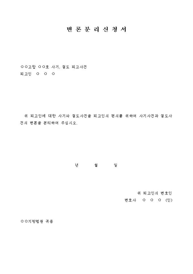 9,000원/월변론분리신청서 입니다. 위 피고인에 대한 사기와 절도사건을 피고인의 편의를 위하여 사기사건과 절도사건의 변론을 분리하여 주십시오. ...